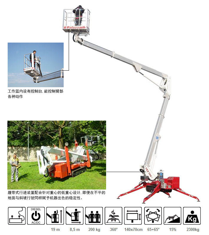 TZX190蜘蛛式曲臂高空作業車是高空作業平臺中重量較輕的伸縮臂升降平臺,其特點是自重較輕,可運用在大廈、商場、酒店等不能承受過重升降設備的場所。運用四條支腿為支撐點,支撐整個設備在升降中的平衡,體形小巧,可通過正常門框,動力為交流電、電瓶或燃油。TZX170蜘蛛車底盤可以配置履帶式和輪胎式兩種行走形式的底盤。